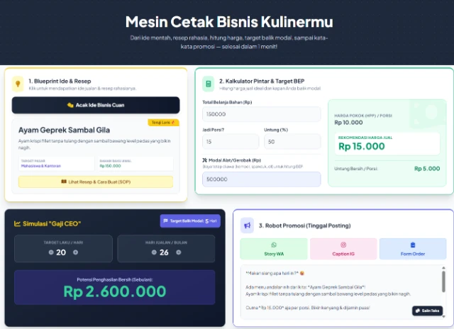 Menggabungkan fungsi Koki (Resep), Akuntan (HPP & BEP), dan Copywriter (Promosi) dalam satu halaman.